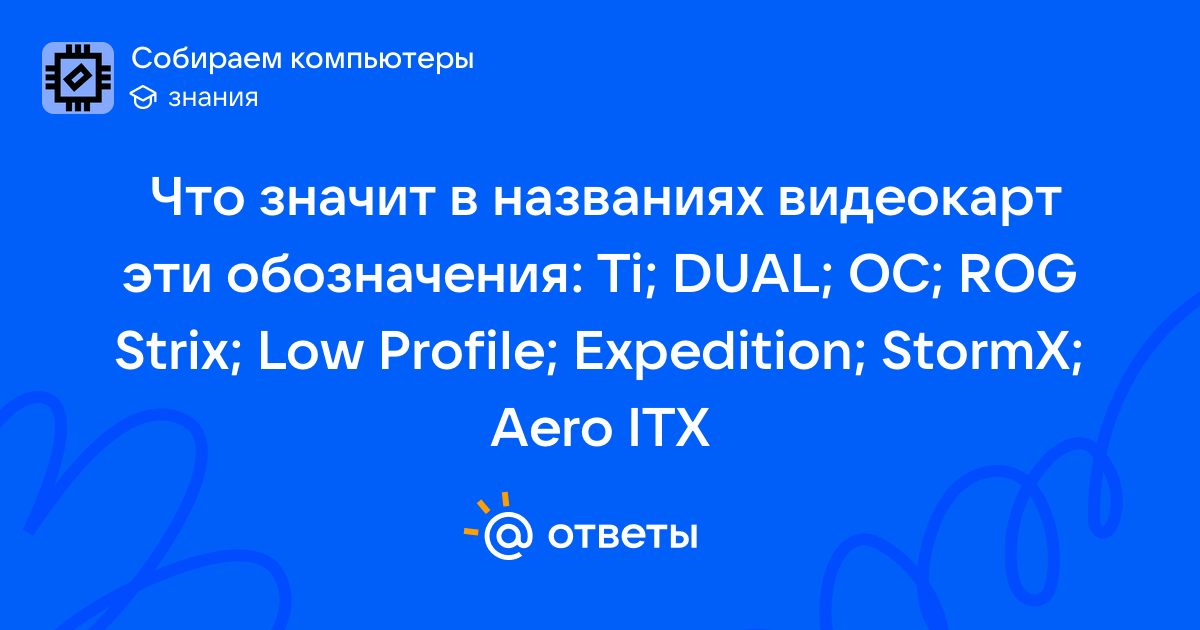 Что значит в названиях видеокарт эти обозначения: Ti; DUAL; OC; ROG Strix; Low Profile; Expedition; StormX; Aero ITX