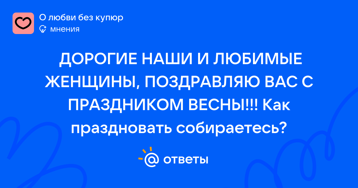 ДОРОГИЕ НАШИ И ЛЮБИМЫЕ ЖЕНЩИНЫ, ПОЗДРАВЛЯЮ ВАС С ПРАЗДНИКОМ ВЕСНЫ!!!! ЗДОРОВЬЯ ВАМ, ЛЮБВИ, ТЕПЛА, МУЖЕЙ С ДЕНЬГАМИ, ВСЕГО САМОГО ДОБРОГО И ХОРОШЕГО, ДОРОГИЕ И ЛЮБИМЫЕ!!! Как праздновать собираетесь?