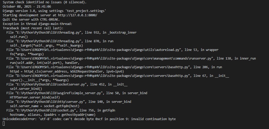 File "D:\Users\ERGOMYSH\.virtualenvs\django-rfHMqoHV\lib\site-packages\django\core\servers\basehttp.py", line 206, in run
