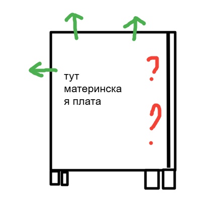 хочу поставить вентиляторы, но не сильно понимаю как бы их поставить, я нарисовал примерно как где стоит сейчас. Знаки вопроса это то где я хочу поставить 2 вентилятора, но не знаю на вдув или выдув? спереди у меня стекло, так что возможности поставить вертушки там отсутствует, остаётся только с боковой части пк , снизу не поставить тоже.