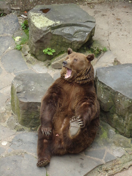 - на фото сидит на пятой точке огромный бурый медведь с открытым ртом. ноги расставлены одной лапой держит ногу. на вид он угарает со смеху.
